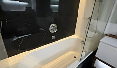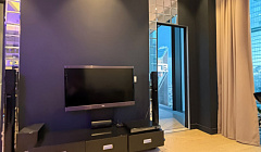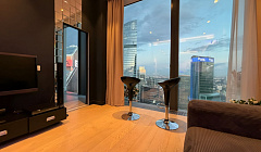 Апартаменты оформлены в стиле хай-тек с зеркальной отделкой и люминесцентными лампами, создавая атмосферу современной роскоши и минимализма. Высокий этаж обеспечивает уединение и спокойствие, а панорамный вид заставляет забыть о суете городской жизни.
