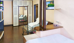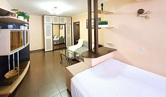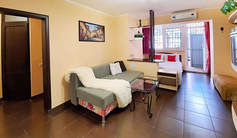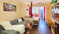 Квартира расположена прямо за жд вокзалом, удобно ездить на электричке по окрестностям. До пешеходной улицы Навагинской минут 15 пешком. В шаговой доступности две Пятерочки, Перекрёсток, кофейни. Квартира расположена на 1 этаже хрущёвки, но полностью отремонтирована. Свежий аккуратный ремонт, новая сантехника, удобная кровать, раскладной диван, полностью оборудованная кухня. Идеально чисто. Огромная терраса (по-сути, отгороженная часть двора) с диваном. Всё очень чисто и аккуратно. Хозяйка приветливая, заселили без проблем.