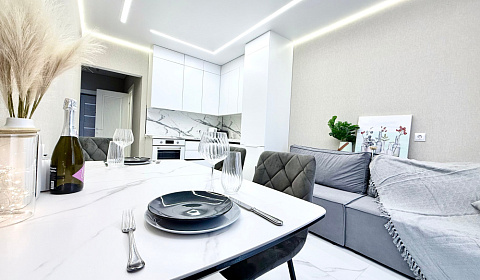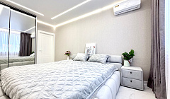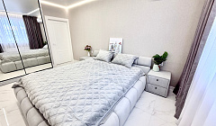 Комплектация: туалетные принадлежности (гель для тела, шампунь, тапочки, зубные щетки и пасты, туалетная бумага, капсулы для стирки, халаты), чай, конфеты, посудомоечная машина, двуспальная кровать, двуспальный диван, постельное белье, полотенца, телевизор, духовой шкаф, варочная поверхность, микроволновая печь, холодильник, стиральная машина, кондиционер, набор посуды и столовых приборов, чайник, фен, утюг, глад. доска, сушилка, интернет.