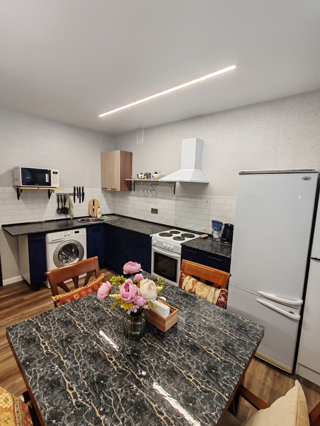 Квартира оборудована всем необходимым для длительного проживания и полноценного отдыха: *Варочная панель *Микроволновая печь *Духовой шкаф *Холодильник *Чайник *Фильтр для воды *Посуда, столовые приборы *Стиральная машинка *Сушилка для белья *Постельное белье, полотенца *Одноразовые косметические принадлежности *ТВ и Wi-Fi *Утюг и гладильная доска