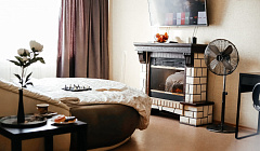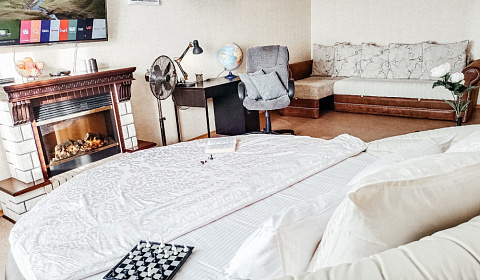Квартира располагает: Собственным балконом с видом на Уральские горы. Современной , оборудованной всей необходимой техникой, кухней Телевизором с плоским экраном и возможностями SMART. Камином.