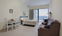 1-комнатные апартаменты общей площадью 50 кв. м (жилая 40м и балкон-терраса 10м) расположены на 5 этаже 9-этажного здания в Отель-Резиденции Ayu-dag Resort & Spa. Расстояние до пляжа - 50м (пляж галечный, оборудован лежаками и зонтиками). Стоимость лежака - 250 руб.