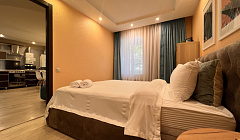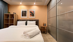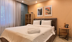 Спальные места: Квартира рассчитана на комфортное проживание 4 человек и оборудована двумя уютными спальными местами. Вас ждет двуспальный диван (160x200 см), а также кровать с удобным ортопедическим матрацем (160x200 см) обеспечивающим качественный и здоровый сон.