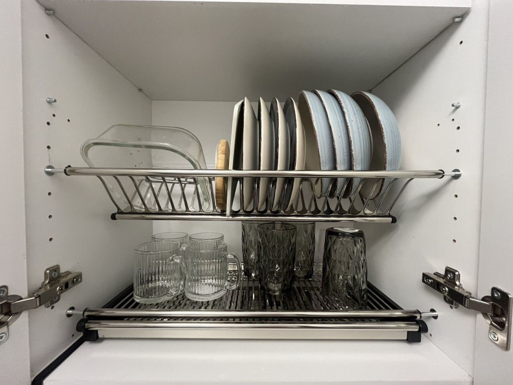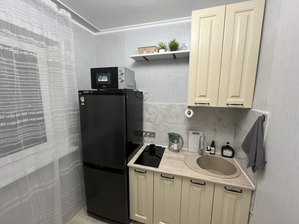 · Полноценная, с обеденной зоной. · Техника: холодильник, электроплита, микроволновая печь, чайник, стиральная машина. · Всё для готовки: полный набор посуды, столовых приборов, средства для мытья.
