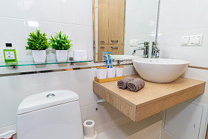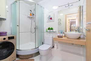-В санузел душевая, стиральная машина с порошком, гель для душа, шампунь и кондиционер для всех типов волос, жидкое мыло, зубные щётки, зубная паста в дозаторе. Комплект полотенец, туалетная бумага, фен.