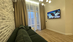 – обеденная зона со столом, смарт тв и диваном, который раскладывается в удобное спальное место рассчитанное на 2-х человек;