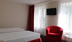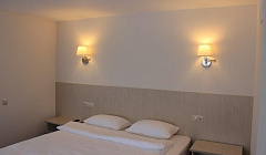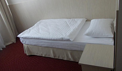Бронировала стандартный номер с двуспальной кроватью, однако, при заезде свободными оказались только стандартные номера с двумя односпальными кроватями. Но администратор предложила нам заселиться в улучшенный номер с большой двухспальной кроватью без доплаты, поэтому мы были только довольны. По нашей просьбе донесли комплект полотенец, чай. Также в номере был небольшой холодильник, что очень пригодилось.