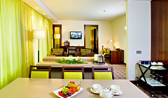 Наши уютные номера оформлены в современном стиле с преобладанием оливковой цветовой гаммы, которая олицетворяется с природой, формированием и ростом. В зависимости от предпочтений мы предлагаем номера разных категорий – от одноместного стандартного, где есть всё необходимое для работы и отдыха, до президентского люкса с обеденной зоной и чайной станцией. Во всех номерах Вас встречают большие панорамные окна, которые впускают в комнату солнце, чтобы сделать Ваше пребывание еще более приятным и светлым.