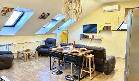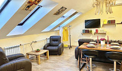 Хорошее расположение. Центр. Достаточно просторно, много мест для сна.Большая кровать + Большой диван. Приятная, уютная атмосфера. Весьма чисто. Приятные, доброжелательные админы) Быстрая реакция на бронь.