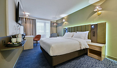 Номер шикарен! Небольшой, уютный, чистый. Кровать очень удобная, матрас жесткий, высокий, подушок 4 штуки, одеяло большое, пушистое, постельное белье чистое, вкусно пахло. Также в номере раскладное кресло, телевизор, стол с зеркалом. Много света, 2 бутылки воды, набор для чая, кофе. В номере есть гладильная доска, утюг, халаты, тапочки, сейф. В душевой комнате и наборы с зубной щеткой и пастой, и расческа с индивидуальной упаковке, и бритвенный набор, мыло, шампунь, гель для душа, набор полотенец. У нас балкон выходил на дорогу и лес. От дороги шума не было слышно