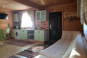 Спальня с большой кроватью, журнальный столик, кресло, ТВ, Душ, санузел, небольшой зал с обеденным столом из распила дерева, скамейка, табуреты, все в одном стиле. ТВ, микроволновая печь, вся необходимая посуда, чайник.