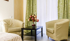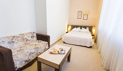 В стоимость номера включен вкусный и питательный завтрак, подаётся в удобное для Вас время. Современные красивые и комфортные номера, выполнены в классическом стиле. В номерах имеется все необходимое для проживания. Мебель, телевизор, холодильник, посуда, средства гигиены (шампунь, гель для душа, зубной набор, бритвенный набор), тапочки, халат. Уборка номеров проводится ежедневно. Мы заботимся о Вас и Вашем здоровье!