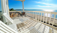 Уютный балкон с двумя лежаками, стульями, столом и креслом-мешком.