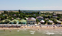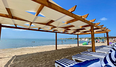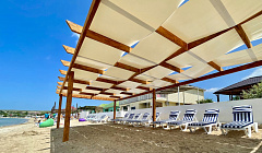 Пляж компактный, отдыхают только постояльцы, есть навес и лежаки.