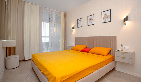 CARAMEL - Апартаменты у моря. Уют в аренду, морской бриз в подарок! Сдаётся в посуточную аренду, новая, современная 2х-комнатная квартира, в шаговой доступности от Морских пляжей, озера "Патрокл" и красивой "Леопардовой набережной". Пешком до пляжа 15-20 минут. Развязка на выезд из города, в город и на о. Русский. Рядом имеются магазины, Супермаркет, Кафе и.д. Автобусная остановка в 5мин. Прекрасный современный двор, где расположены: спортивная площадка, детская площадка, баскетбольное поле, места отдыха.