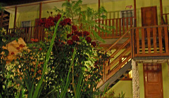 Вид из окон выходит на благоухающий сад, где произрастают разнообразные розы, юкки, туи, петунии.
