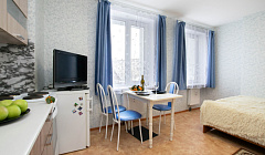 По сути маленькая квартира-студия. Всё необходимое по жизни присутствует. Кровать удобная, двухспальная. Одеяла раздельные. Первый этаж. В подъезде есть подъемник для маломобильных. Окна на достаточно тихий задний двор.