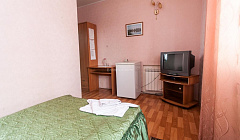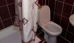Номер весьма уставший. Сантехника древняя и не самая чистая. Одно маленькое зеркало в ванной. Фен (убитый) по запросу, и им надо умудриться воспользваться, т.к. розетка над унитазом. Шкаф не предусмотрен для того, чтобы в него вешать вещи (вешалки есть, но штанга закреплена неправильно, невозможно ничего повесить). Расходников нет (только жидкое мыло).