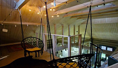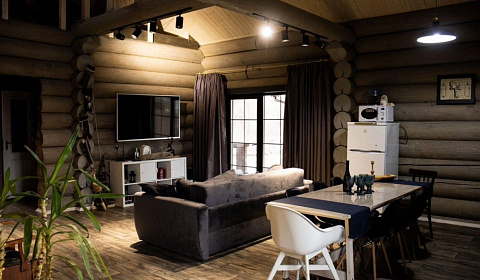 На первом этаже располагается кухня, переходящая в обеденную зону с большим столом . В доме три просторные спальни с двуспальными кроватями, одной детской кроватью (для совсем маленьких соберём дополнительную кроватку), санузел с душевой кабиной и стиральной машиной. Также имеется уютненький лофт - мансарда с мягкими матрасами для посиделок.