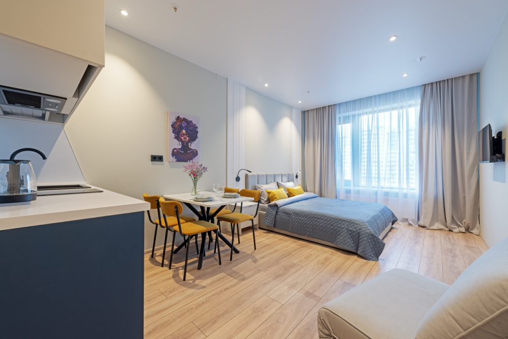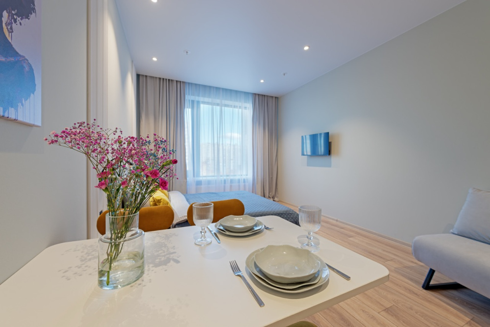 Квартира полностью соответствует всем фото. В ней вас ждут: В кухонной зоне: микроволновая печь, холодильник, варочная панель, чайник, посуда и столовые приборы. Чай, кофе, сахар, соль, конфеты. В ванной комнате: туалет, душ, стиральная машина, фен, утюг, набор гигиенических средств, тапочки, полотенца для ног, рук и тела на каждого гостя. В местах отдыха: постельное белье на каждого гостя, ЖК телевизор со Smart TV, высокоскоростной Wi-Fi в номере бесплатно, шторы блэкаут.