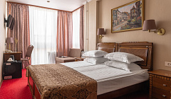 Двухместные номера 1-ой категории «Стандарт+» — это прекрасный вариант для комфортного длительного проживания, особенно если вы планируете не только ночевать, но и заниматься в отеле повседневными делами, например, работать за компьютером. Номера категории «Двухместный стандарт» оснащены одной двуспальной или двумя односпальными кроватями и по площади достигают 16 квадратных метров, что больше, чем в аналогичном эконом-варианте. Кроме того, у каждого номера есть своя приятная особенность — это или светлое окно в комфортабельном санузле, или выделенная в небольшой кабинет рабочая зона. Благодаря этому, в номере данной категории будет удобно не только ночевать, но и работать. На территории отеля работает ресторан европейской кухни, гости всегда могут рассчитывать на быструю подачу блюд и первоклассный сервис.
