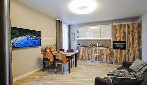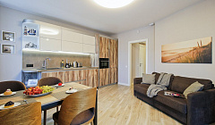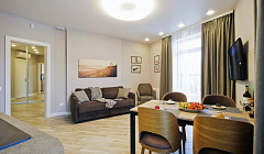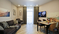 Свежий ремонт и отличный интерьер. Хотя я даже не всем пользовалась. Есть вся необходимая техника (от посудомойки до фена), посуда, полотенца, плед, зонт, фен и прочие мелочи, которые часто можно забыть в поездку или неудобно с собой возить. Светлая теплая ванная комната с душевой кабиной, тоже всё удобно и комфортно. Большая высокая кровать и балкончик с видом на море и парк особенно порадовали.