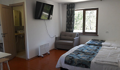 Кухня в номере: мультиварка, микроволновка, плита, холодильник, чайник, посуда. Санузел в номере: современная душевая система, гигиенический душ. Уютный двор с обеденной зоной.