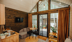 ~ кухня-гостиная с панорамным видом на лес;