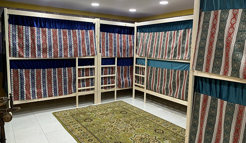 В хостелеВ хостеле общая комната с 8 спальными местами. Туалет и ванная комната совмещённые, располагаются во дворе. К услугам гостей: душевая кабина, фен, полотенца на каждого гостя, холодная и горячая вода. Во дворе стол и стулья, самовар, где каждый может заварить и выпить чай. Также для в распоряжении гостей газовая печь, холодильник, отдельная морозильная камера и вся необходимая посуда, мангал для приготовления шашлыка.