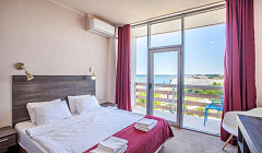 Находится на берегу моря, берег высокий, однако это скорее плюс, чем минус. Вниз есть деревянные ступеньки, возможно с коляской не очень удобно