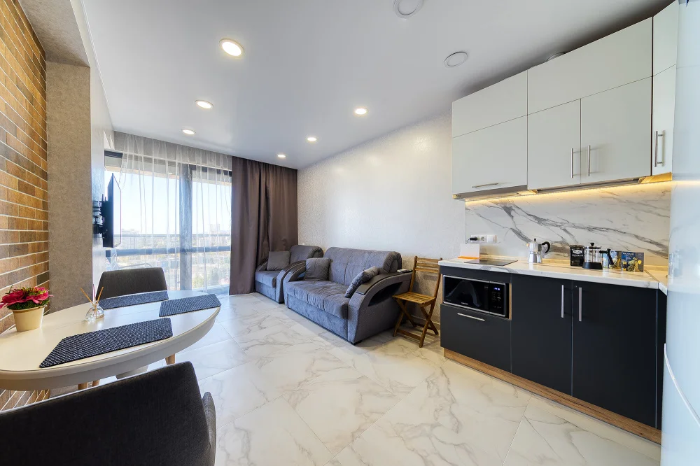 Всем доброго дня! Отель произвел замечательное впечатление. Чисто. красиво, удобно. Территория закрытая, прекрасно оформленна, работает освежающий фонтан. Сами апартаменты оказались достаточно комфортными, есть все необходимое, включая стиральную машину и даже пылесос Керхер. Посуда, постельное белье, полотенца, халаты чистые и современные. Особое внимание хочется обратить на панорамное окно с прекрасным видом на море. Рядом есть Пятерочка, кулинария, Перекресток. Единственный небольшой минус- это 20-25 мин до моря. Но мне это совершенно не портило настроение. Это центр и пока дойдешь, прогуляешься по скверам, кофе, магазинчикам..Отдельное спасибо девочкам за охлажденное шампанское и местную сладость. Рекомендую как для приятного семейного, так и индивидуального отдыха.