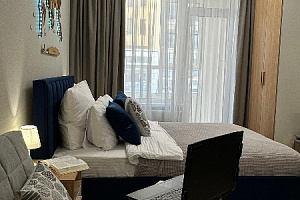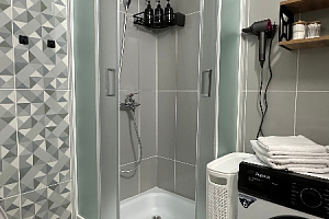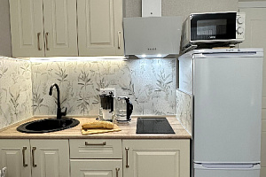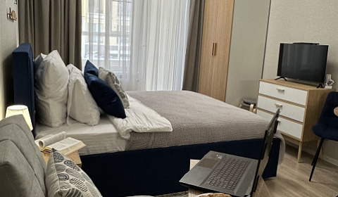 -двухспальная кровать с ортопедическим матрасом, -небольшое раскладное кресло, -вся бытовая техника и посуда (холодильник , варочная панель , микроволновая печь , чайник , стиральная машина , утюг), -постельное белье и набор полотенец для каждого гостя .