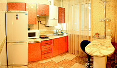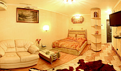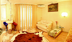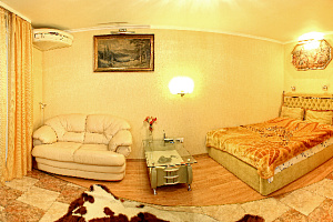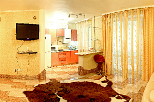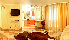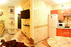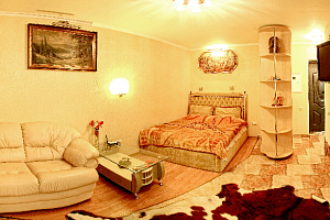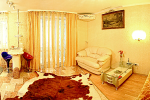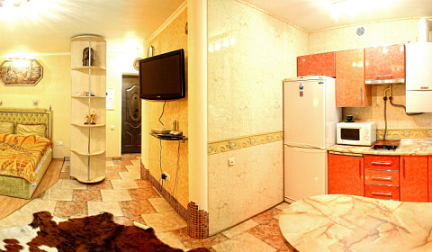 Модная квартира-студия для избирательных гостей. Выполнен дизайнерский ремонт. Двухспальная кровать с ортопедическим матрасом (king-size), кожаный диванчик раскладной (полноценное односпальное место), встроенные шкафы-купе, сервировочные столики, мощный кондиционер. Квартира оснащена двухконтурным котлом, система «теплый пол», независимое автономное отопление, горячая вода круглосуточно. Санузел выложен модной плиткой, укомплектован душевой кабиной а-класса с гидромассажем. Полы — эффект мокрого пола с подогревом, барная стойка, стильные стулья. Кухня с встроенной техникой в стиле modern, ж/к телевизор 42«, dvd-плеер, спутниковое tv, wi-fi. Застекленный балкон, как продолжение комнаты, оборудован стиральной машиной, зеркальным шкафом-купе и уголком для отдыха. Квартира для самых изысканных гостей.