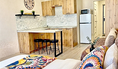 • Двуспальная кровать (160х200) • Раскладной диван ( 160х200) • Оборудованная кухня (холодильник, варочная панель, микроволновая печь, чайник) • Стиральная машина, фен, утюг, гладильная доска, сушилка для одежды • Набор посуды и столовых принадлежностей на 4 персоны • ТВ и Wi-Fi • Мыльные принадлежности, полотенца, средства гигиены.
