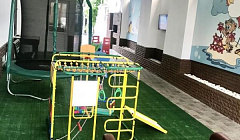 - детская площадка с мягким покрытием, игрушками, диваном и телевизором