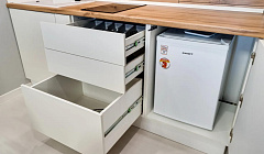 - Большой холодильник - Вытяжка - Электрическая варочная панель (Печь для приготовления пищи) - микроволновой печью и электрическим чайником. - Вся необходимая посуда для приготовления пищи