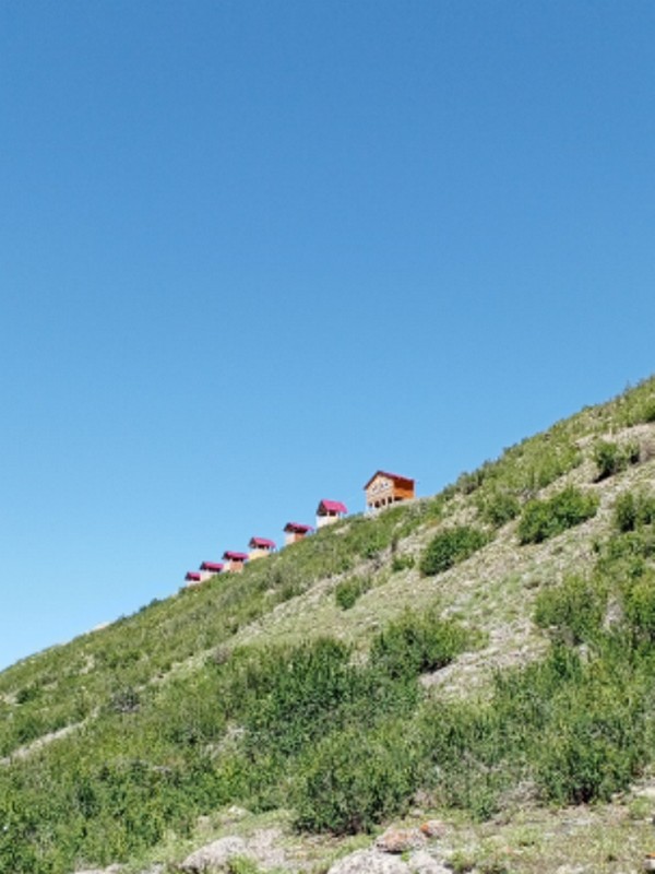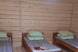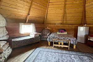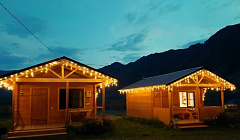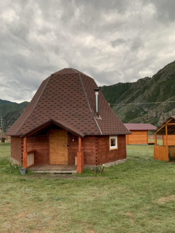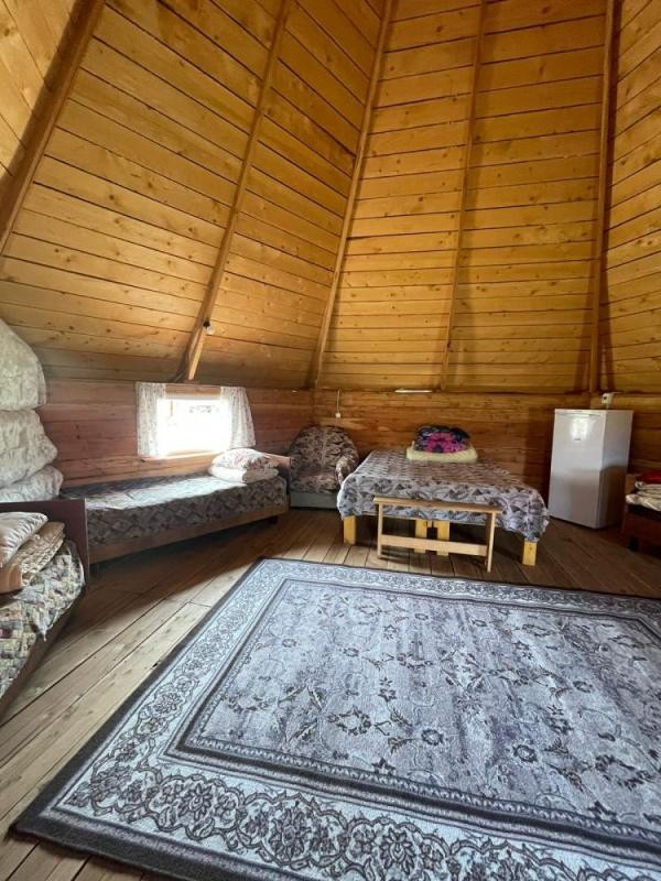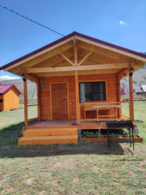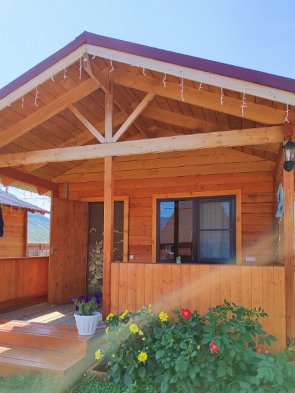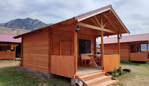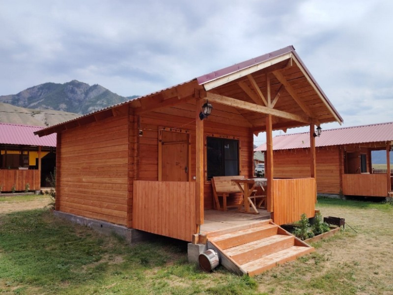 На базе отдыха "Четыре богатыря" располагаются 8 домиков и 1 аил, изготовленные из экологически чистых и натуральных пород дерева.