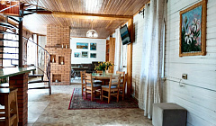 Первый этаж: • Просторная гостиная с камином и удобным диваном. • Кухонная зона с барной стойкой полностью укомплектована всей необходимой посудой и современной бытовой техникой: холодильником, электроплитой с духовкой, электрочайником, микроволновкой и посудомойкой• Обеденная зона с телевизором.