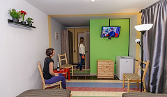 P.s. Уважаемые управляющие, это не претензия, а вкусовщина: предлагаю снаружи гостиницу тоже сделать разноцветной, а то по фоткам номеров ожидаешь снаружи тоже цветовую феерию, а там почти городской камуфляж.