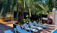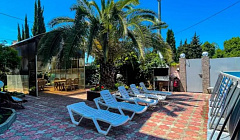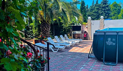 Территория гостевого дома достаточно просторная.Огороженный двор с роскошными пальмами.Во дворе просторный бассейн для взрослых и детей,есть баня ,правда за отдельную плату.Так же во дворе есть зона отдыха со столиками и мангалом,общая просторная кухня -столовая для самостоятельного приготовления.Кухня полностью оснащена посудой и техникой,прямо как дома.