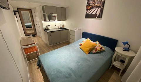 Внутри апарта вы найдете уютное пространство с современным дизайном. Для сна Вас ждёт комфортная двуспальная кровать с ортопедическим матрасом, подушками и одеялами из гипоаллергенного материала. Ваш безмятежный сон обеспечат свежее постельное бельё и тишина, что редкость для центра Москвы. На прикроватную тумбочку можно положить любимую книгу или телефон, пульты от телевизора-смарт и кондиционера. Студия также оснащена микроволновой печью, индукционной варочной панелью, небольшим холодильником с морозильной камерой, электрическим чайником и утюгом. Есть стол для работы или обеда. Кухонная зона укомплектована не только бытовой техникой, но и посудой для еды и напитков, а также приготовления любимых блюд, которыми Вы сможете насладиться в спокойной обстановке. Ванная комната оснащена душем, стиральной машиной, феном и полотенцами. Просушить полотенца или бельё возможно на электрической или раскладной сушилке. В студии также есть беспроводной Wi-Fi.