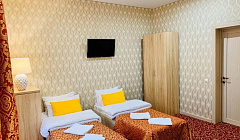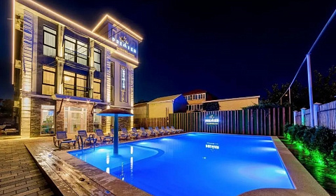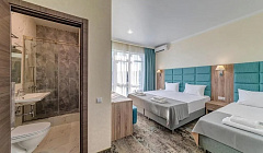 Номер и санузел хорошие, ремонт качественный, местоположение отеля в тихом месте, в дали от центральной набережной. Для тех, кому нужен только пляж)) до моря идти минут 10, до аквапарка Золотая бухта идти полчаса. К завтракам претензий нет, по три блюда разом, и дети и взрослые найдут, что поесть. А вот с ужином и обедом хуже-одно блюдо маленькими порциями за 350р с человека. Дешевле, чем в центре, но и до центра далеко, только на машине, а рядом с отелем одна столовая, в которой ещё хуже выбор))