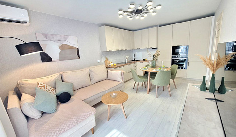 - Спальные места: Вместимость до 6 человек (одна спальня с двуспальной кроватью, вторая спальня с двумя односпальными кроватями, а также раскладной диван в гостиной).