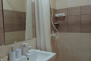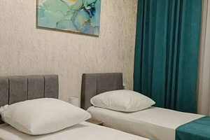 2-комнатный 4х-местный номер 32 кв. м. с большой удобной двуспальной кроватью с ортопедическим матрасом в одной комнате. В другой комнате 2 удобные односпальные кровати с ортопедическими матрасами, которые можно сдвинуть в двуспальную кровать с топпером. При заселении 5 гостя предусмотрено раскладное кресло с ортопедическим матрасом. Все номера оснащены всем необходимым. Есть туалет, душевая, фен, большое зеркало. На каждого гостя предусмотрены 3 белых полотенца+1 синее для бассейна. В номере гардеробная, телевизор, холодильник, сейф, сплит-система, мебель, Wi-Fi интернет, отопление. На окнах плотные шторы (блэк-аут). Потолки в номерах натяжные, люстры с переменным светом, есть прикроватные светильники. Уборка в номерах производится через 3 дня, уборка мусора из номеров производится ежедневно. Смена постельного белья по графику. Возле каждого номера есть столик, сушилка для одежды.