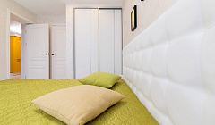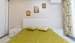 3-х комнатные двухуровневые апартаменты с 2-мя сан. узлами и собственной большой террасой, с которой открывается красивый вид на горы — это идеальный вариант для ценителей комфорта и размещения до 6-ти гостей. Общая площадь — 90 кв. м. Для удобства гостей апартаменты оснащены всей необходимой мебелью и бытовой техникой. Вход в апартаменты расположен на 1-м этаже. Апартаменты имеют панорамное витражное остекление, москитные сетки. Терраса оснащена большим обеденным столом и креслами из ротанга. Апартаменты оборудованы на каждом этаже ванной комнатой с туалетом, имеют 2 изолированные комнаты и просторную гостиную с полноценной кухонной зоной. Для комфортного проживания в апартаментах предусмотрены: двуспальная кровать с ортопедическим матрасом, два раскладывающихся двуспальных дивана – кровати, два 3х-створчатых шкафа-купе, шкаф с полками, платяной шкаф, прикроватные тумбочки, комод, стол обеденный, стулья, стиральная машина, паровой утюг и гладильная доска, напольная сушка, пылесос. Каждая комната апартаментов оборудована системой кондиционирования и отопления, плазменным телевизором, беспроводным Wi—Fi. На втором этаже в просторной гостиной обустроена современная кухня и обеденная зона, оснащенные всей необходимой техникой класса премиум и посудой для приготовления и приема пищи: варочная панель, духовой шкаф, мойка, посудомоечная машина, микроволновая печь, большой холодильник с морозильной камерой, электрический чайник, электрическая рожковая кофейная машина, столовые приборы, посуда для приготовления и приема пищи, чайный сервиз, бокалы для воды и вина. На каждом этаже апартаментов предусмотрена отдельная туалетная комната: на первом этаже размещена душевая кабина, раковина и сан. узел. На втором этаже — полноценная ванна, сан. узел, большое зеркало, фен, полотенцесушитель и автономная бойлерная система для бесперебойной подачи горячей воды. Гостям при заезде предоставляется чистое постельное белье, махровые банные и лицевые полотенца, тапочки.