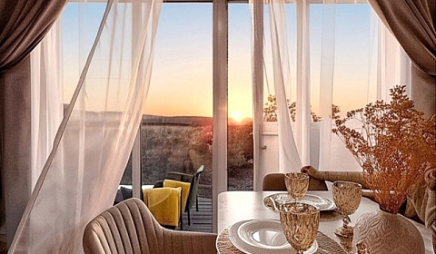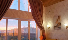 Из панорамных окон открываются прекрасный вид на город и на уходящее солнце.