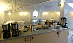 В постоянном доступе, в течении всего дня, столы, питьевая вода, микроволновка, где можно разогреть себе пищу.