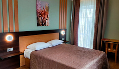 - двухместный номер (14 шт.): двуспальная кровать, телевизор, телефон, холодильник, туалет + душ.