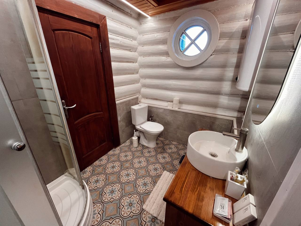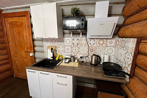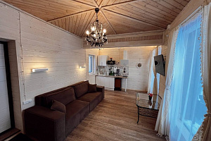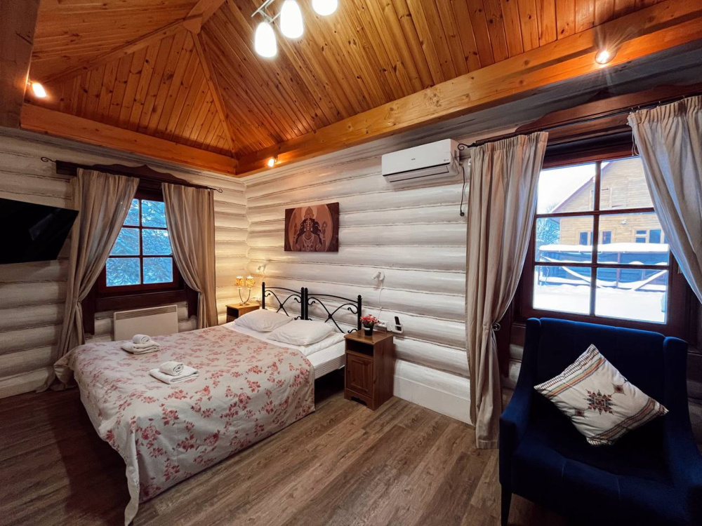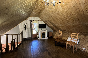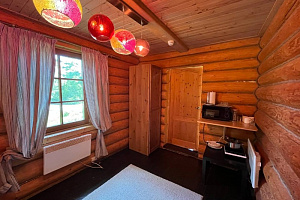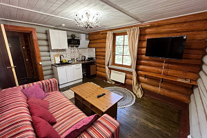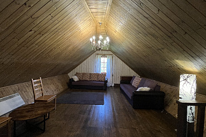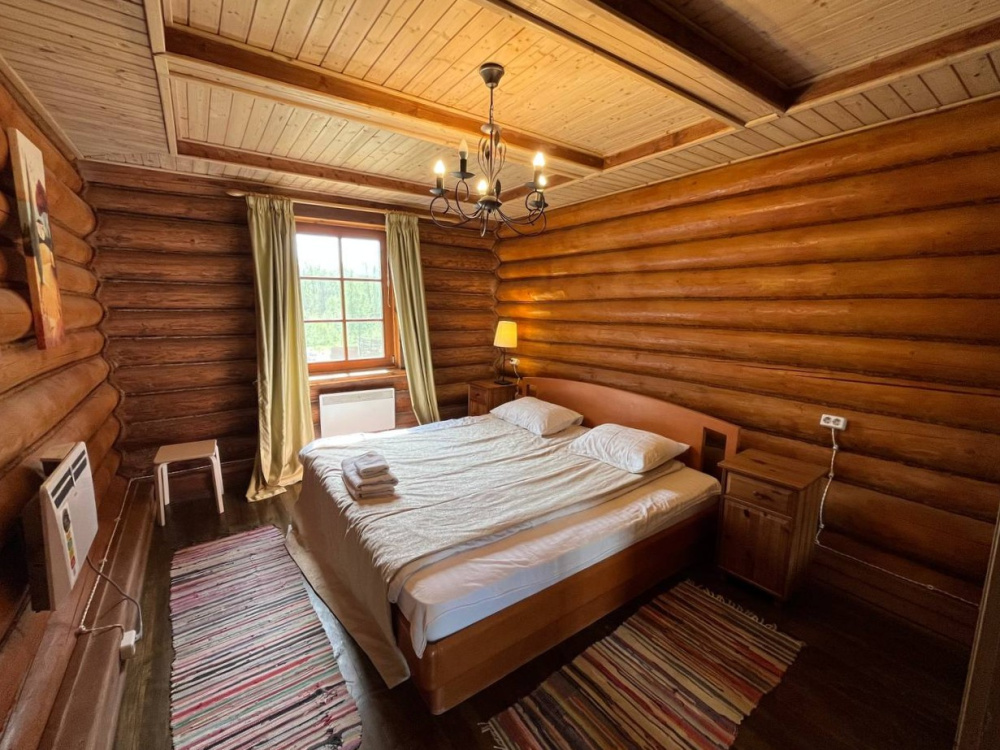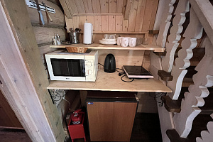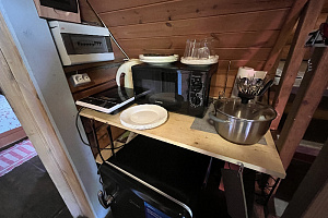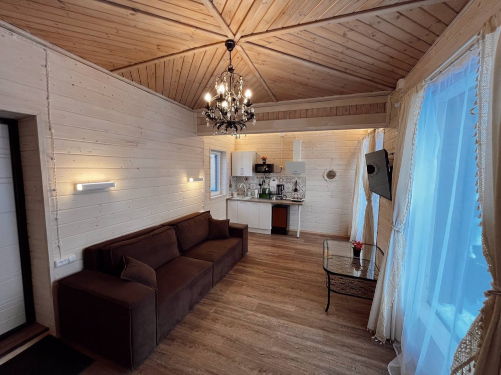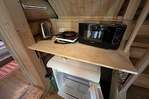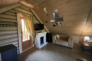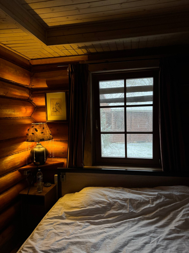 Домик брали на 6 человек, номер 7. Скажу сразу - на сильные морозы не рассчитан. На первом этаже в коридоре и туалете было очень холодно. В комнатах и на втором этаже - тепло. Кухни нет, есть плитка на одну конфорку, но готовить по факту негде - плитка и маленький холодильник в коридоре. С другой стороны, на территории есть возможность приготовить обед в арендованной кухне, но мы этим не воспользовались. Диваны на втором этаже продавленные, и по оснащению много пожеланий: вообще не продумана расстановка мебели в доме! Усе как-то без души… ну вот есть камин, и он красивый, а вот светильников для уюта не хватает… и ковер на пол положить можно другой, более яркий и стильный, и карнизы починить..