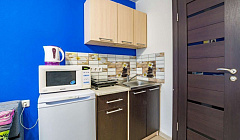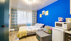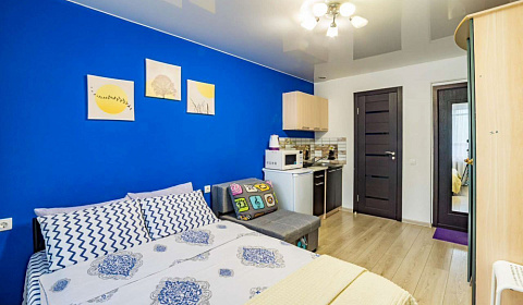 Оригинальные по дизайну студия подходят для комфортного проживания одного-двух человек. Студия размещается на высоком первом этаже жилого дома имеется балкон. Окна выходят во двор.